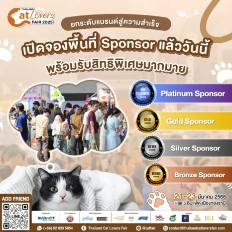 ยกระดับแบรนด์สู่ความสำเร็จเปิดจองพื้นที่ Sponsor แล้ววันนี้ พร้อมรับสิทธิพิเศษมากมาย Thailand Cat Lovers Fair 2025 เปิดให้จองพื้นที่ ทำเลทอง ภายในงานมีเปิดจองพื้นที่หลายขนาด – Platinum Sponsor– Gold Sponsor– Silver Sponsor– Bronze Sponsor แต่ละระดับก็จะมีสิทธิพิเศษที่ต่างกัน งานนี้ไม่เหมือนงานอื่น ๆ แน่นอน เพราะ Sponsor ทุกเจ้าที่มาร่วมงานจะได้รับสิทธิ์แจก Sampling หน้างานแถมยังได้พื้นที่โปรโมทในสื่อออนไลน์ทุกช่องทางเพื่อเพิ่มโอกาสให้แบรนด์ได้เป็นที่รู้จักมากขึ้นไม่ว่าจะเป็น Website, Facebook, Instagram,LINE OA และ TikTok ในส่วนของรายละเอียดของ Sponsor เพิ่มเติมสามารถติดต่อสอบถามทางไลน์ได้เลยค่ะ สนใจจองพื้นที่ Add LINE : https://lin.ee/OV2lAV1Q การันตีผลงานจากผู้จัดงาน Dog Show และ Pet Variety อย่าปล่อยให้หลุดมือ ทำเลทอง เป็นที่น่าจับตามองของเจ้าของแบรนด์ จองก่อน มีสิทธิ์ก่อน เปิดให้จองแล้ววันนี้ พื้นที่ของ Sponsor อย่าพลาดโอกาสดี […]